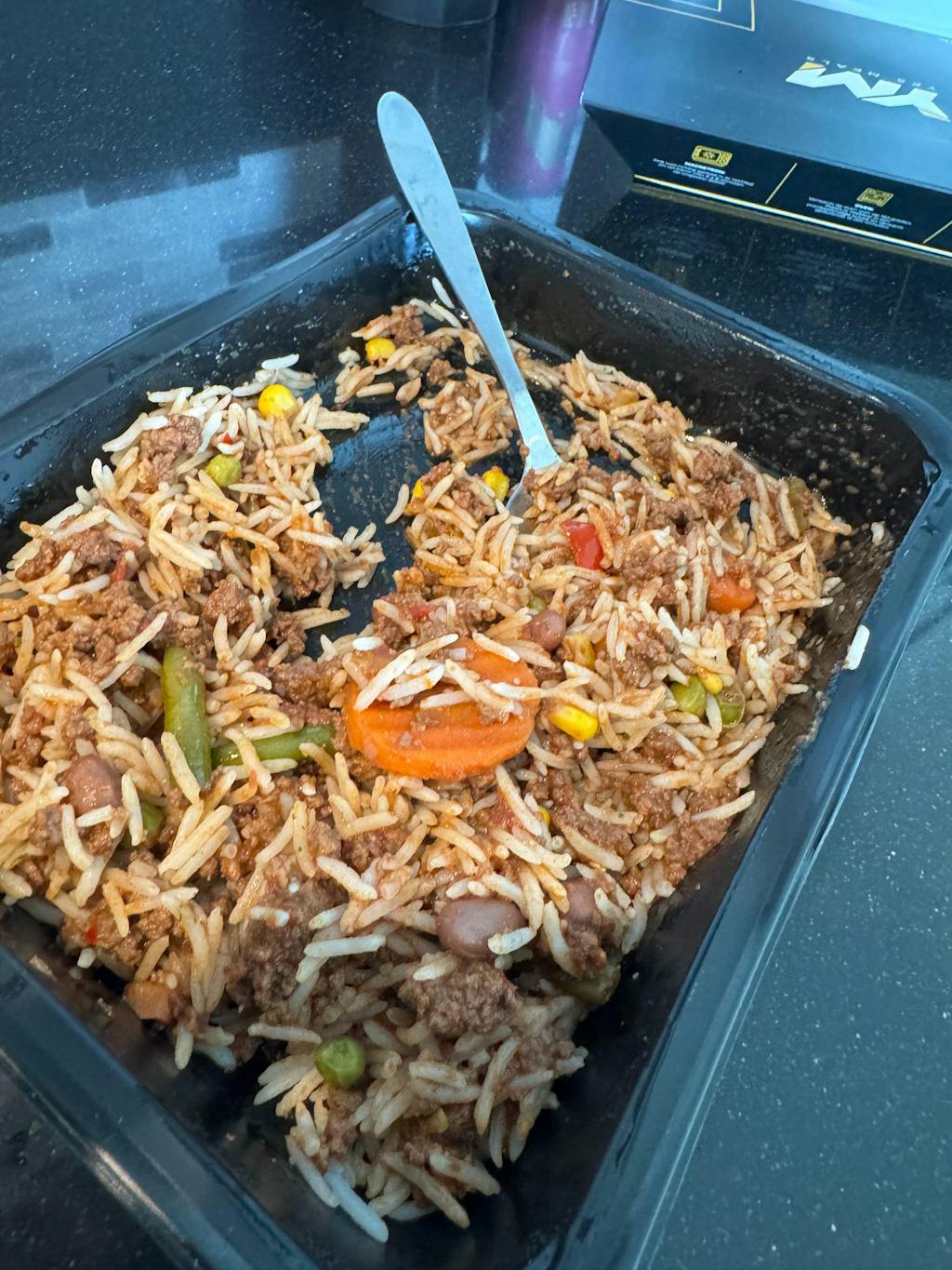 Basmati Rijst, Rundergehakt (Halal), Tomaten, Ui, Wortelen, Rode Paprika, Mais, Sperziebonen, Kidney Bonen, Doperwten, Keltisch Zeezout, Knoflook, Paprika, Chili, Chili Peper, Peterselie, Kaneel, Komijn, Zwarte Peper, Room Boter (gras gevoerd).