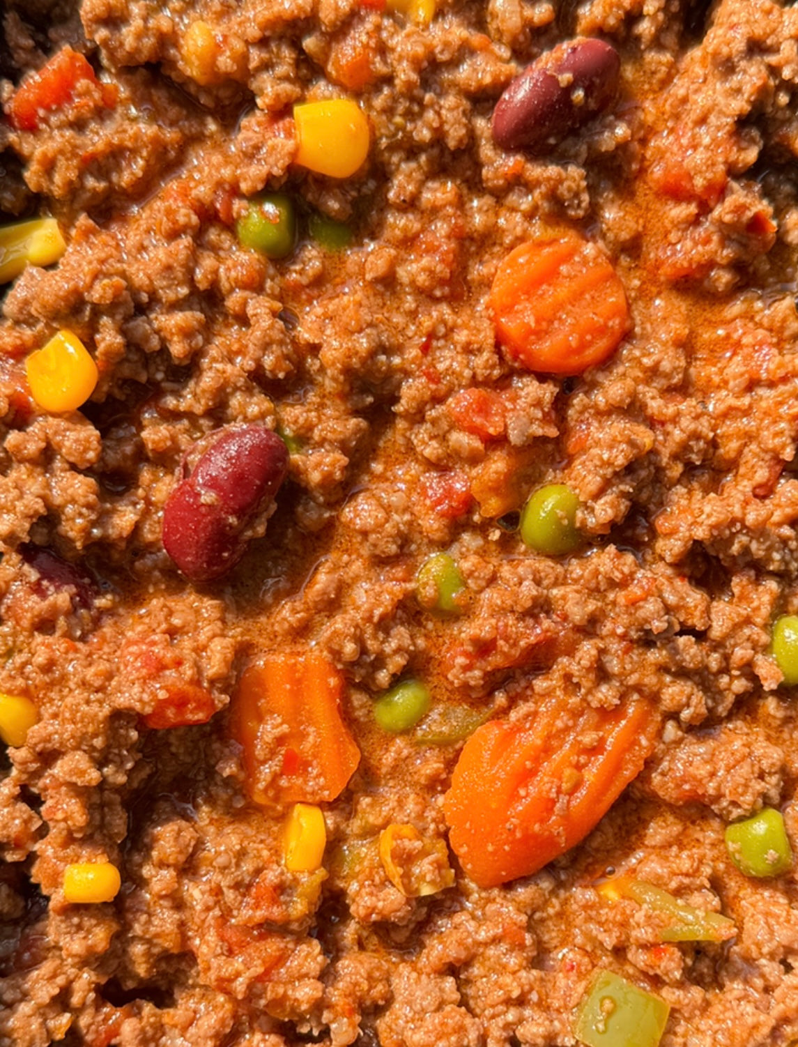 Rundergehakt (Halal), Paprika poeder, Knoflook, Rode paprika, Groene paprika, Doperwt, Wortel, Chili flakes, Sperziebonen, Komijn, Peterselie, Keltisch Zeezout, Room Boter (Gras Gevoed).
