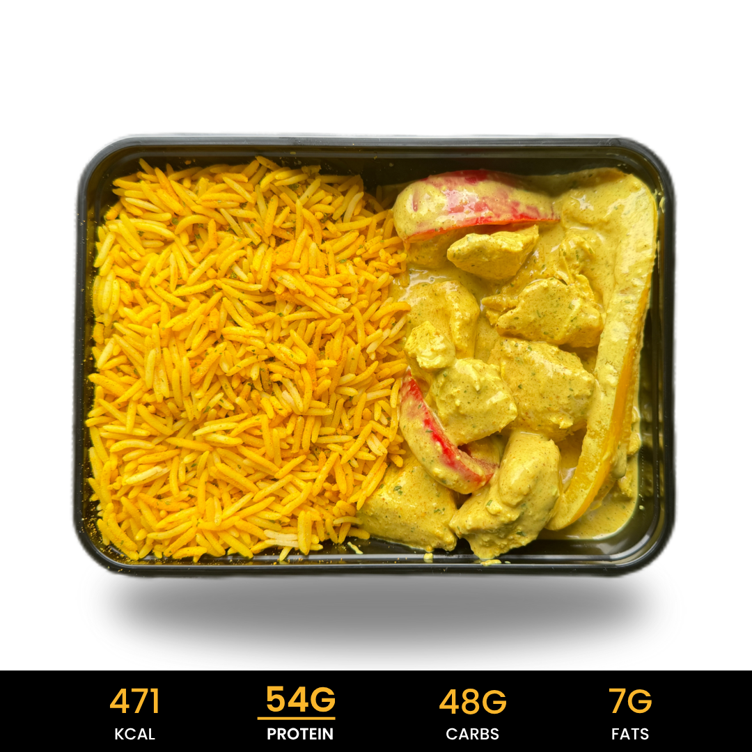 Basmati Rijst, Kipfilet (Halal), Rode Paprika, Gele Paprika, Kokosmelk (Kokos, water), Korianderzaad, Kurkuma, Komijnzaad, Gedroogde Chilies, Fenegriekzaad, Mosterdzaad, Peperkorrels, Gember, Knoflook, Keltisch Zeezout, Kardemon, Peterselie, Room Boter (Gras Gevoed)