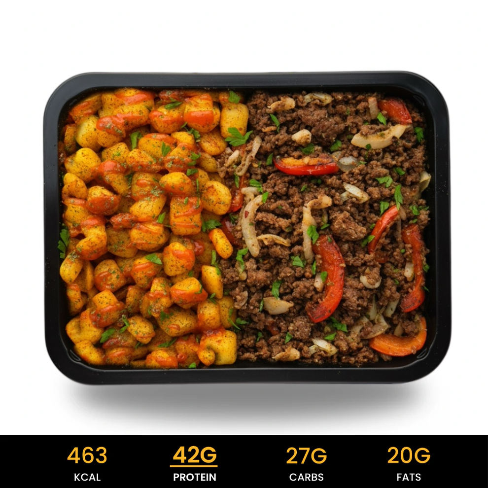 Aardappel, Rund gehakt(Halal), Hele rode paprika, Hele ui, Hele knoflook, Knoflookpoeder, aardappelzetmeel, Rode paprika poeder, Gemberpoeder, Komijn, Rookaroma, Zwarte peper, Peterselie, Rode chilli pepers, Voedingszuur azijnzuur, citroenzuur, Oregano, Kardemom, Dille, Keltisch zeezout, Boter(gras gevoerd).