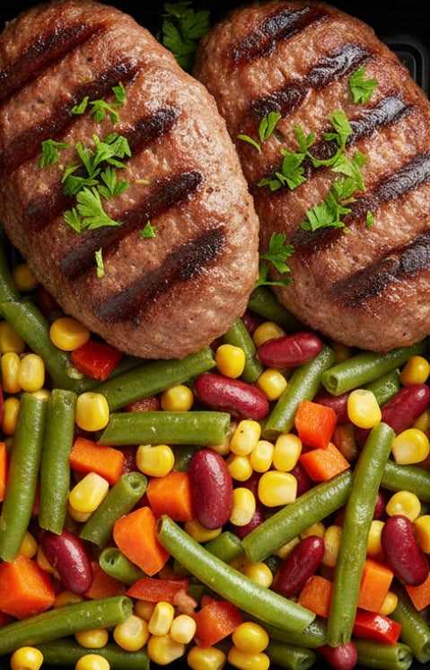Rundergehakt (Halal), Mais, Rode Paprika, Kidney Bonen, Sperziebonen, Doperwt, Wortel, Paprika poeder mild, Knoflook, Tijm, Oregano, Peper Wit Gemalen, Ei, Keltisch Zeezout, Room Boter (Gras Gevoed)