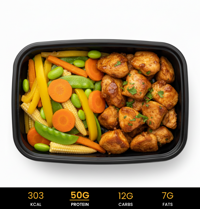 Kipfilet (Halal), Edamame bonen, Wortel, Baby maïs, Gele paprika, Ketjap Manis, Knoflook, Peterselie, Gember, Zwarte Peper, Keltisch Zeezout, Room Boter (Gras Gevoed)