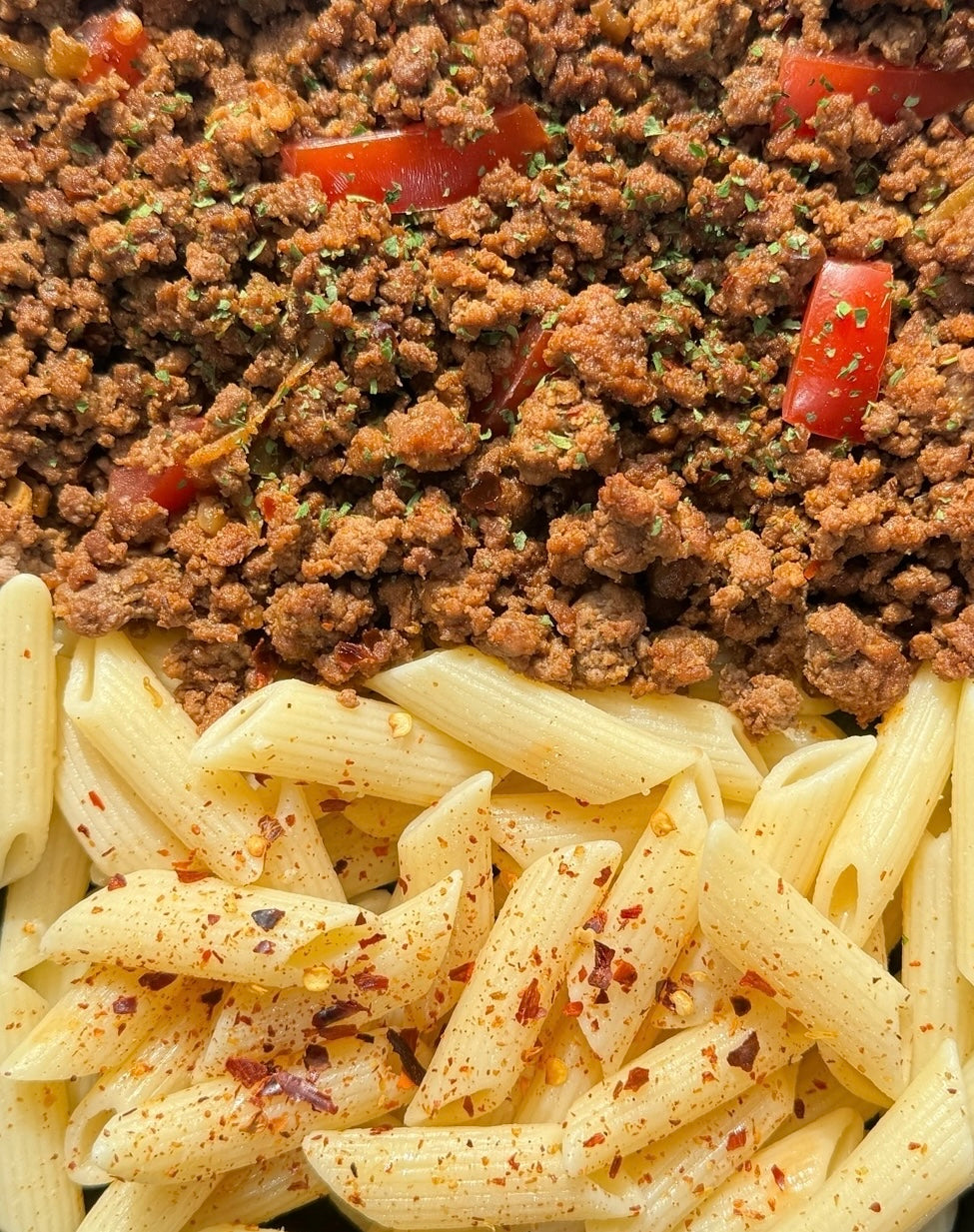 Durum Tarwe PASTA, Rund gehakt(Halal), Rode paprika, Hele ui, Paprika poeder, Knoflook, Hele chili, Peterselie, Chili poeder, Zwarte peper, Keltisch zeezout, Boter(grasgevoerd).