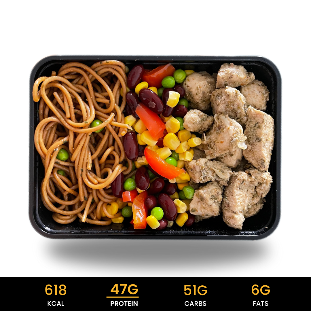 Geniet van de smaakvolle Surinaamse Bami met Mexicaanse groenten en Italiaanse kip. Deze voedzame maaltijd biedt de perfecte balans van gekruide bami, gezonde groenten en onze malse Italiaanse kip. Ideaal voor een energieke lunch of avondmaaltijd.