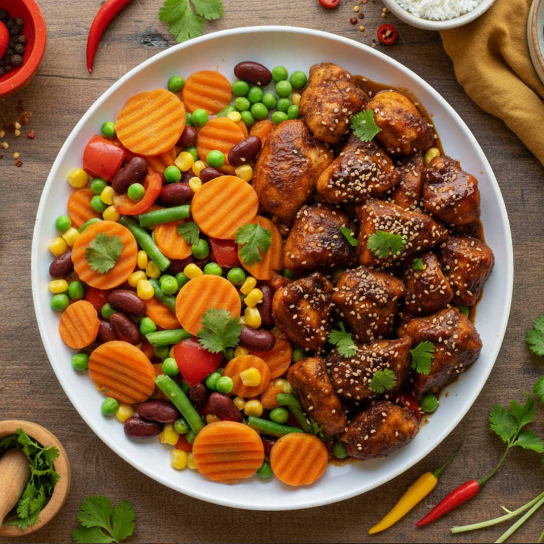 Kipfilet (Halal), Mais, Wortel, Kidney Bonen, Rode Paprika, Doperwten, Sperziebonen, Ketjap Manis, Ketoembar, Knoflook, Peterselie, Gember, Zwarte Peper, Keltisch Zeezout, Room Boter (Gras Gevoed)