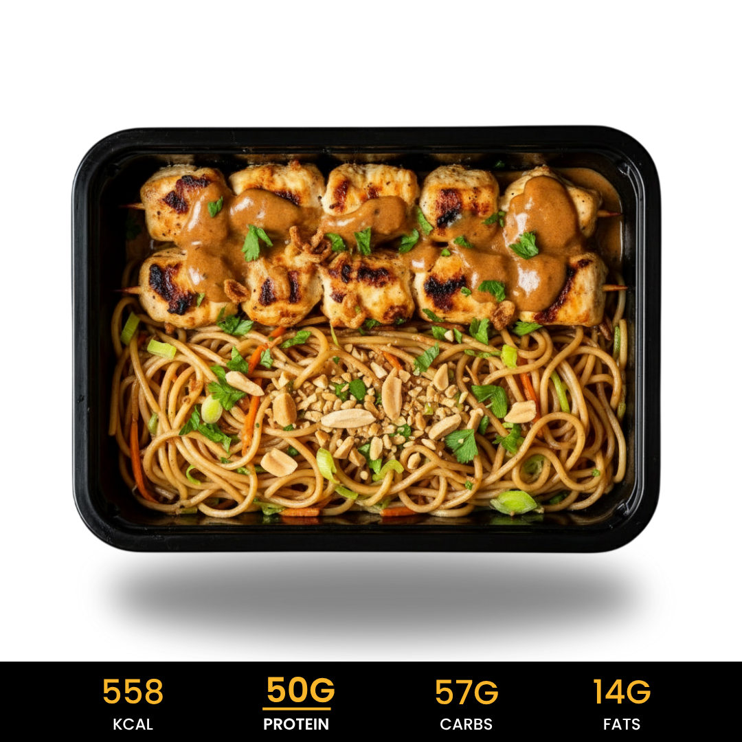 Durum Tarwe PASTA, Kipfilet (Halal), Ketjap Manis, Ketoembar, Gember, Peterselie, Doperwten, 100% Pindakaas, Kokosmelk (water, kokos), Chili Flakes, Citroensap, Sambal Oelek, Knoflook, 5-Spice, Keltisch Zeezout, Room Boter (Gras Gevoed).