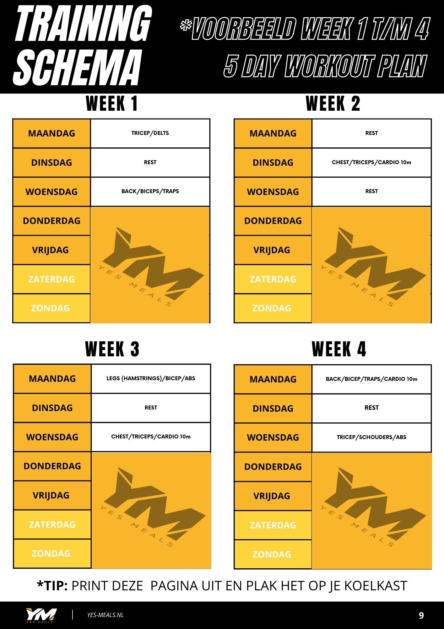 Door de aanschaf en het gebruik van dit traject verklaart de koper dat hij/zij in goede lichamelijke conditie verkeert en geen medische indicaties of medicatie heeft die deelname aan dit traject zouden kunnen beperken of nadelig beïnvloeden. YesMeals aanvaardt geen aansprakelijkheid voor eventuele blessures of andere gevolgen die voortvloeien uit het volgen van het aangeschafte traject. De koper is zelf verantwoordelijk voor het juiste gebruik van het traject. Het wordt ten zeerste aanbevolen om het traject in een sportschool of fitnesscentrum te volgen voor optimaal resultaat. Onze schema's zijn ook gericht op een vlees etend dieet!